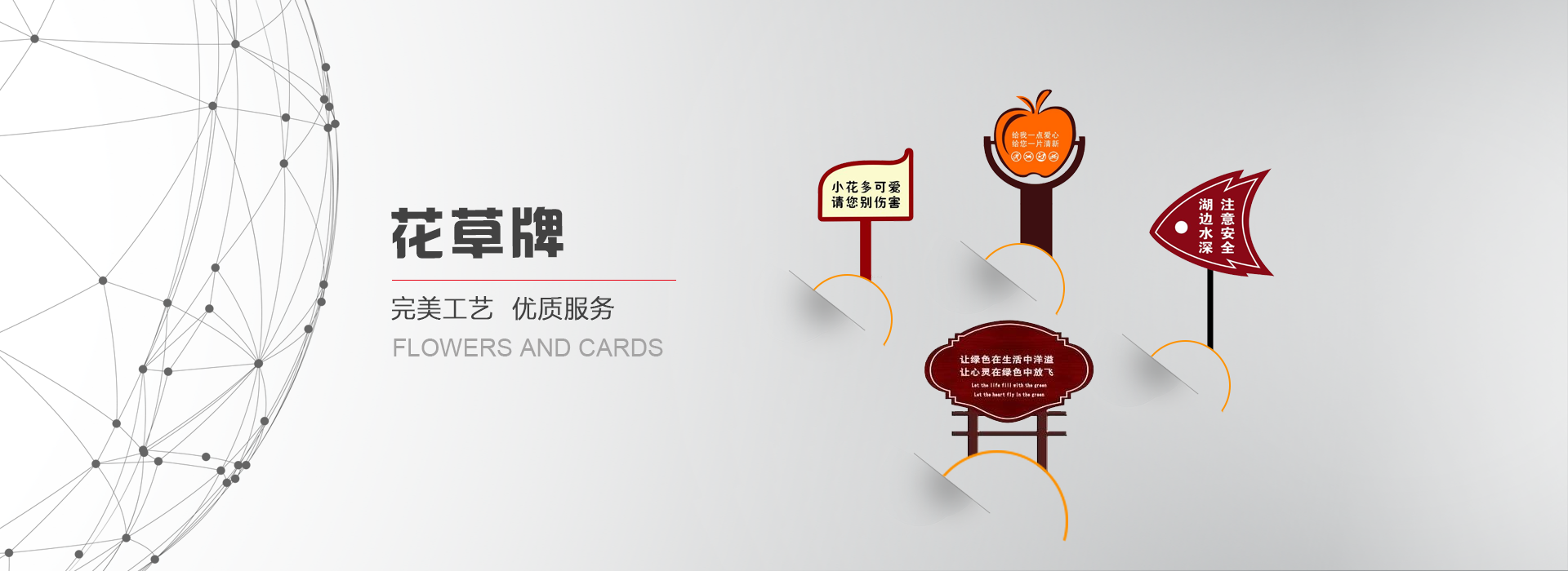 花草牌是指樹立在花草叢中用于提示愛護的標識牌。又稱牌或草牌,屬于溫馨提示的范疇。花草牌一般較矮,一般高度在40公分到1.2米之間,是雙面,厚度一般是4公左右。有鋼板的,有純實木的,或上述材質相互結,制作工藝為: